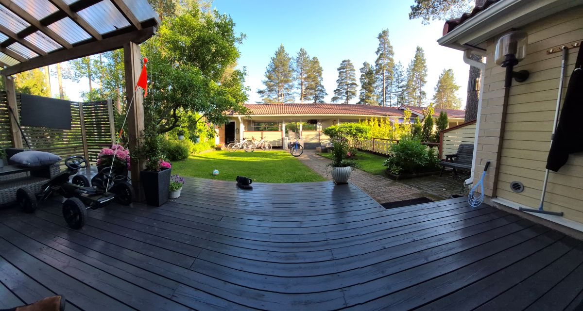 Nelihenkinen perhe asuu 140-neliöisessä, vuonna 1990 rakennetussa kaksikerroksisessa kaukolämpörivitalossa. Alakertaan on asennettu lattialämmitys, ja pihassa on noin kymmenen neliön sähkölämmitteinen työhuone.